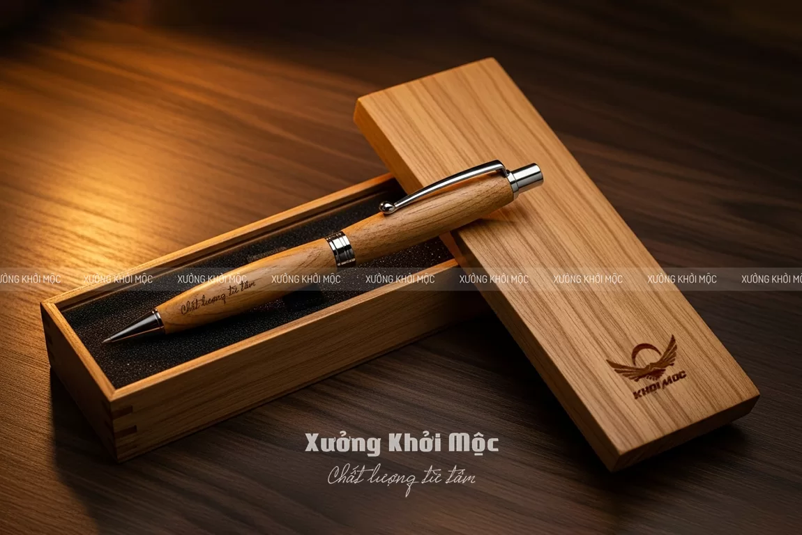 Bút bi gỗ thủ công kèm hộp gỗ khắc logo – món quà doanh nghiệp lý tưởng
