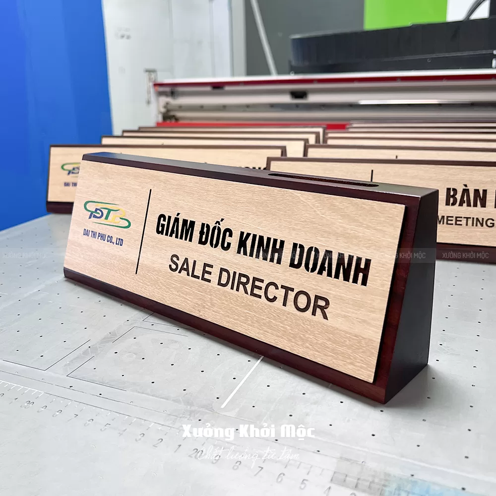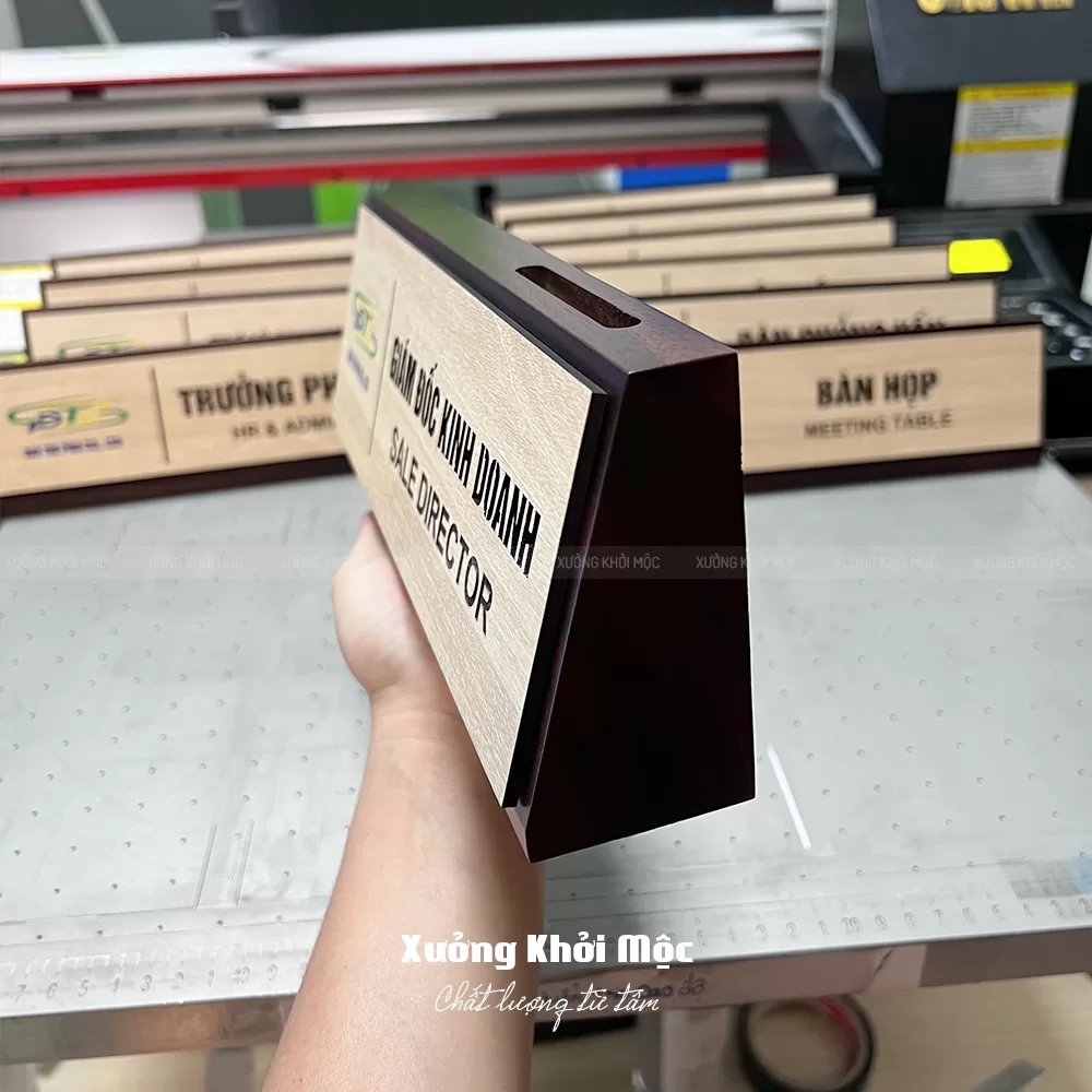 Bảng chức danh gỗ để bàn cao cấp, phù hợp cho giám đốc và lãnh đạo, thể hiện sự chuyên nghiệp trong không gian làm việc.