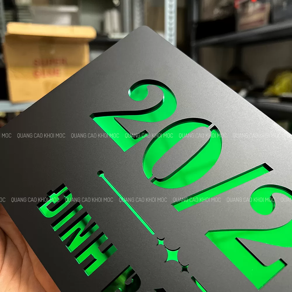 Quy cách gia công Cắt laser 2 lớp (lớp nền + lớp mặt), lắp ghép theo bố cục tối ưu độ đọc