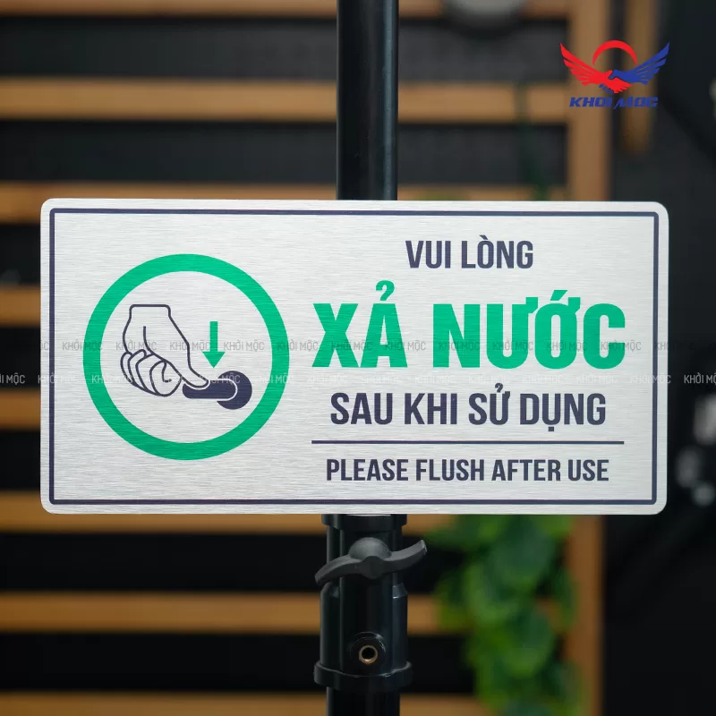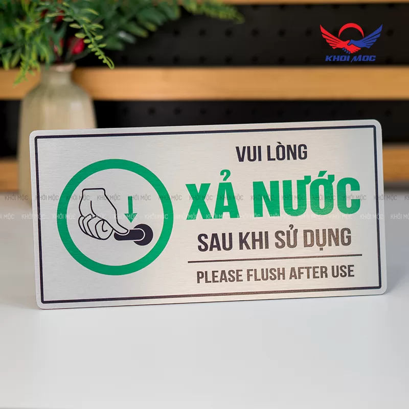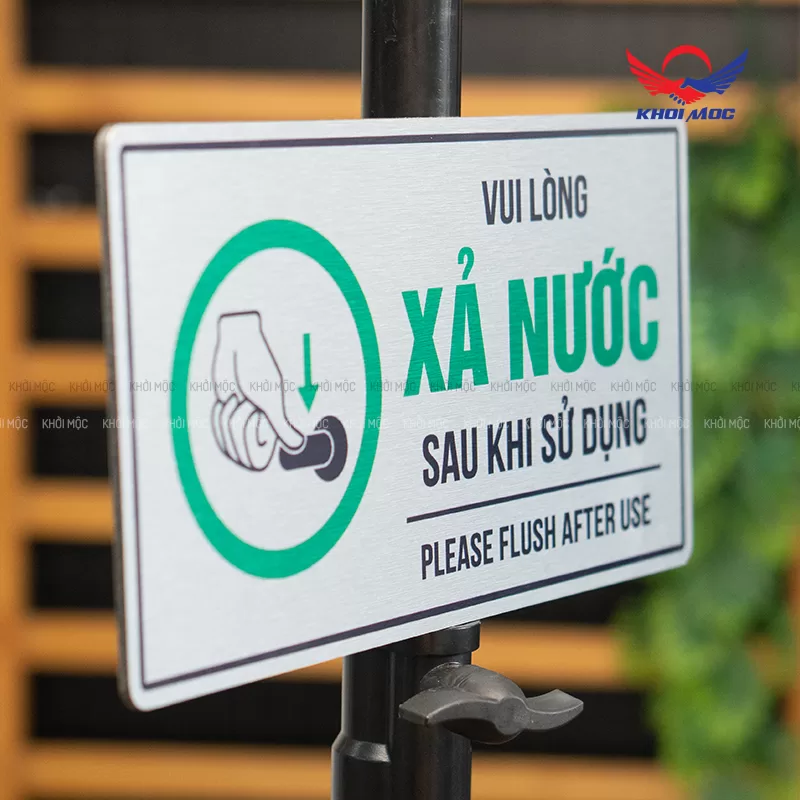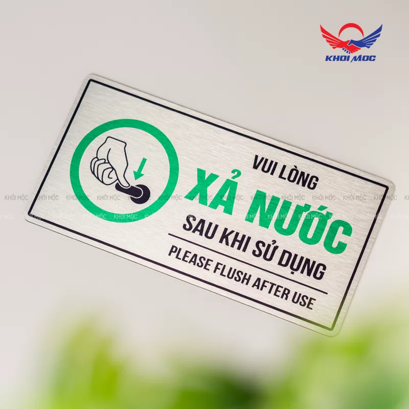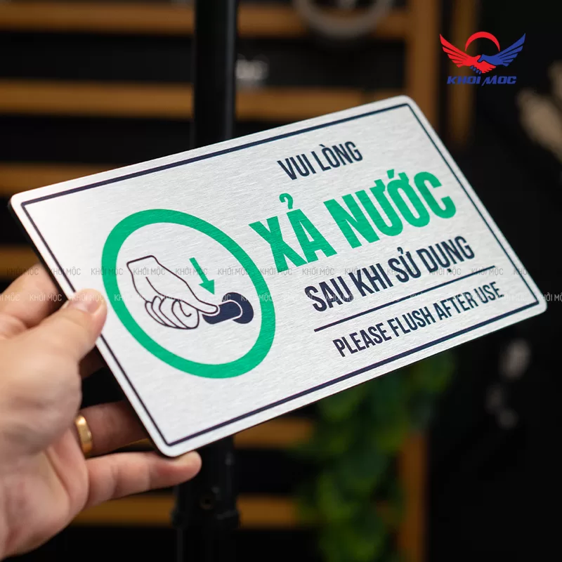 Biển báo nhắc nhở xả nước sau khi sử dụng BAL09, chất liệu alu bền đẹp, nội dung song ngữ Việt – Anh, dán nhanh, phù hợp nhà vệ sinh văn phòng, nhà xưởng, quán cafe